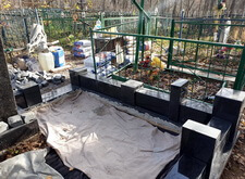 Затем мы облицевали гранитном основание для памятника, немного приподняв его над бетонным периметром. Все работы на участке проводились при помощи уровня, а потому перекосы из-за перепада высот абсолютно исключены.