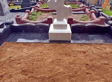 Последние фотографии отражают внешний вид участка после выполнения заказа: на территории места захоронения остался песок и пока что отсутствуют памятники. Перед тем, как окончательно завершить нашу работу, мы порекомендовали клиенту изредка обрабатывать мраморный крест специальным составом.